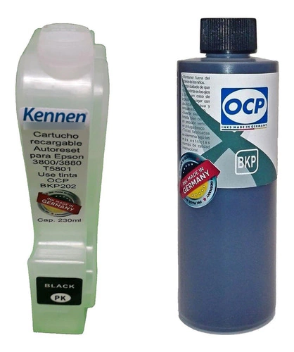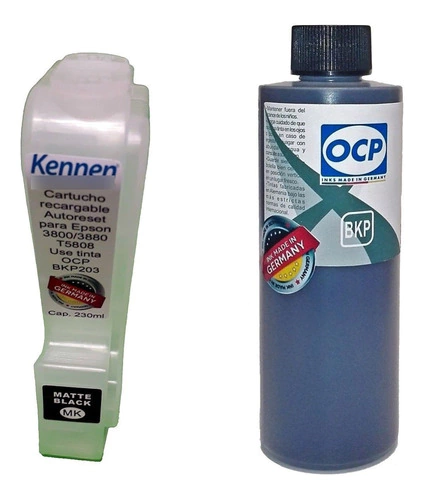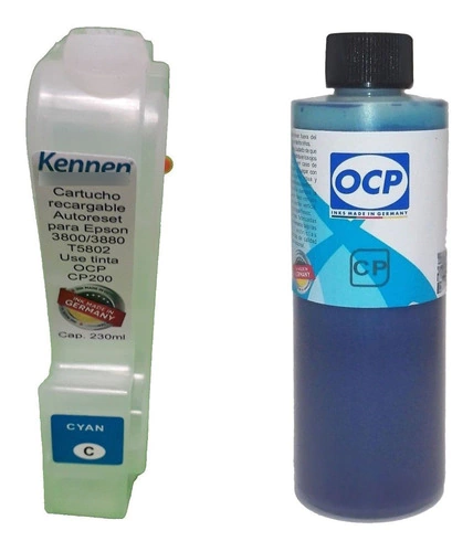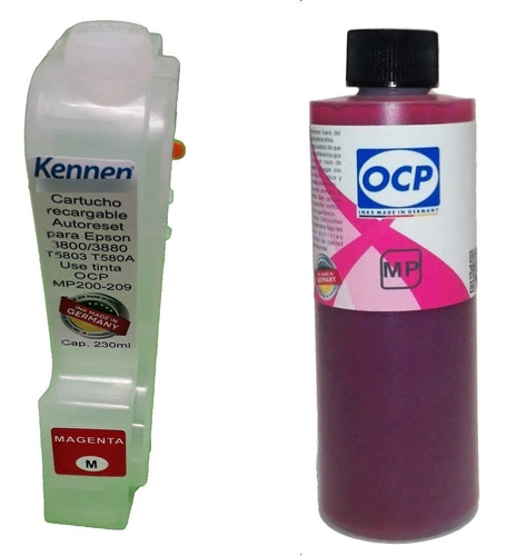 Cartucho Recargable 3XL+ 250ml de tinta Alemana OCP (Versus 80ml del cartucho de fábrica) Alternativo para Epson 3880 3800 ¡Ahorrá 75% de costos con excelente calidad de impresión y cuidando tu impresora con las tintas Alemanas OCP! Colores disponibles: negro mate, negro foto, cian, magenta, amarillo, cian claro, magenta claro, negro claro, negro claro claro ¡IMPORTANTE! Forma de elegir el color/modelo de cartucho Cada color tiene un código único, así que simplemente seleccioná el color del cartucho que necesitás y dale click a "Agregar al carrito" Luego con la flecha hacia atrás de la barra del navegador, volvé a la publicación, seleccioná el siguiente color y repetí "Agregar al carrito" Una vez que hayas seleccionado todos los colores que necesitás, podés seguir comprándonos otros productos o si ya tenés todo lo que necesitás, simplemente presioná "Comprar carrito" para pasar a la página de cobro. De esta manera, cuando recibamos tu compra, ya sabemos cuáles son los cartuchos que tenemos que prepararte y tu pedido será despachado mucho más rápido. - Compatible con Impresoras de gran formato Epson Stylus PRO 3800, Epson Stylus PRO 3880 Especificaciones generales: Familia de Cartuchos: T5801 / T5802 / T5803 / T5804 / T5805 / T5806 / T5807 / T5808 / T5809 / T580A / T580B NOTA: se requiere el chip del cartucho agotado para completar el programa del chip autoreset. Capacidad del Cartucho 230 ml Tinta Incluida: 250ml Tipo: tintas de alta pigmentación con Aditivos limpia inyectores, retardantes de evaporación y redispersantes. Indelebles en papel común y foto. Altísimo light y dark fading Pigmentos Polimérico de precisión. Cartuchos / Color T5801 PHOTO BLACK T5802 CYAN T5803 / T580A MAGENTA T5804 YELLOW T5805 LIGHT CYAN T5806 / T580B LIGHT MAGENTA T5807 LIGHT BLACK T5808 MATTE BLACK T5809 LIGHT LIGHT BLACK *Brother, Canon, Epson, HP, Lexmark, Ricoh, Mimaki, Mutoh y demás marcas de impresoras se mencionan al sólo efecto de orientar al consumidor sobre la compatibilidad del producto. las mismas son marcas registradas por sus respectivos dueños y no avalan ni tienen vinculación alguna con el producto ofrecido. OCP es marca registrada de OCP GmbH de Alemania quien fabrica y garantiza el producto a través de su representante en Argentina, Kennen SRL. Kennen es marca registrada de Kennen SRL.